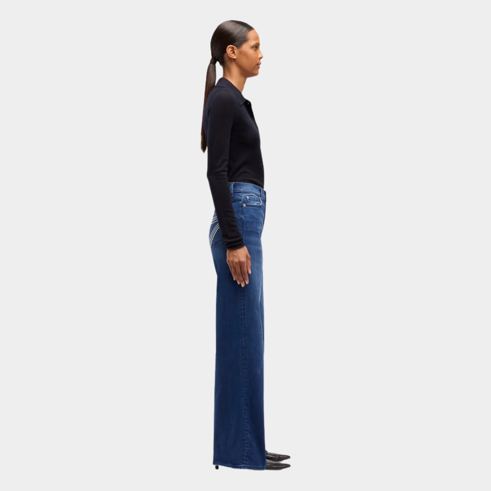 Designed to sculpt and elevate, the 7 For All Mankind Ultra High Rise Jean in Crater blends modern edge with timeless craftsmanship. This ultra-high waist silhouette hugs through the hips and thighs before releasing into a full, leg-lengthening wide leg. Crafted from smooth, stretch-infused denim, it offers all-day comfort with a flattering, figure-enhancing fit. The Crater wash features a rich indigo base with subtle whiskering and fading for a lived-in yet polished look. Finished with the iconic 7 embroidery in contrast white stitching on the back pockets, this jean is a true standout—equal parts classic and contemporary, no tailoring required.