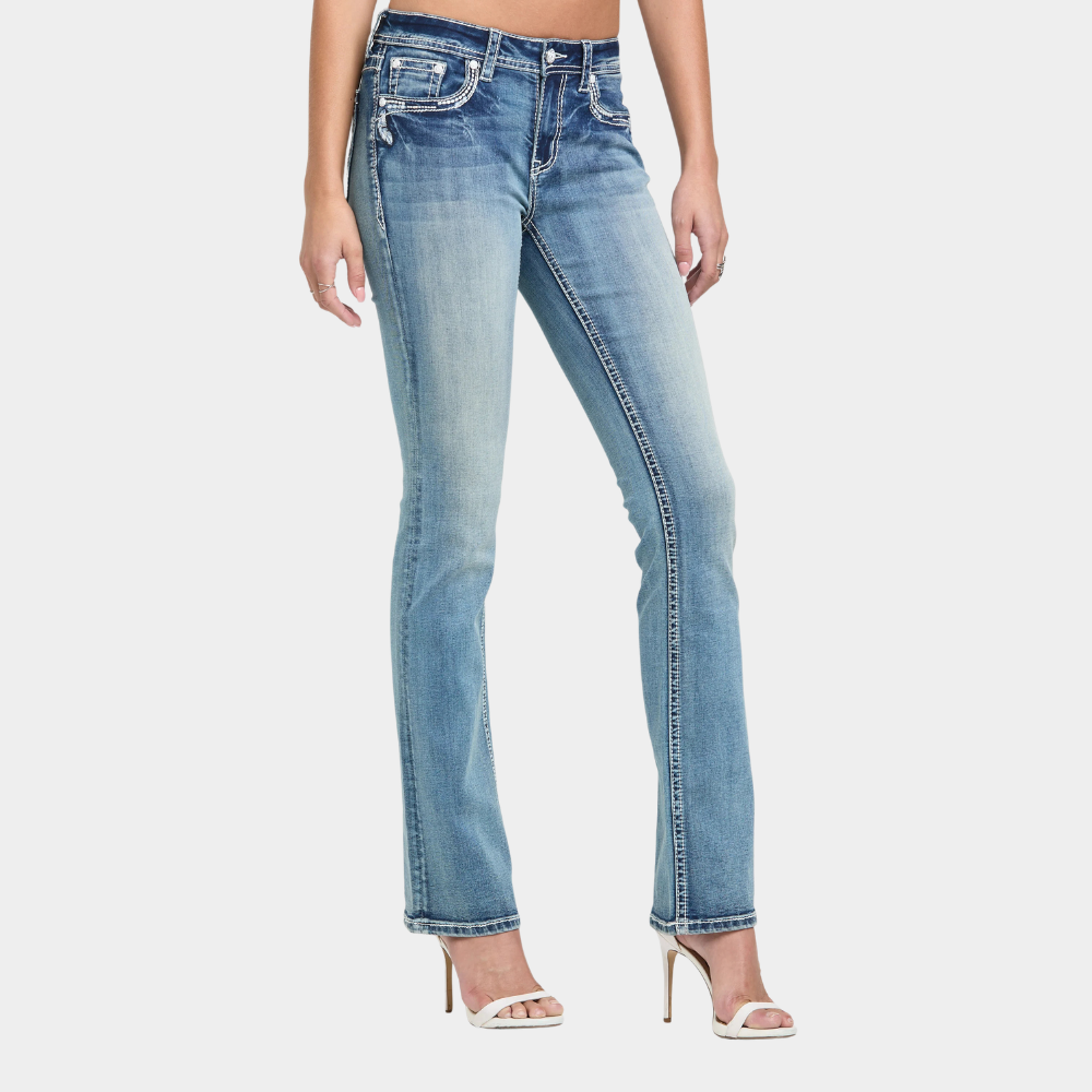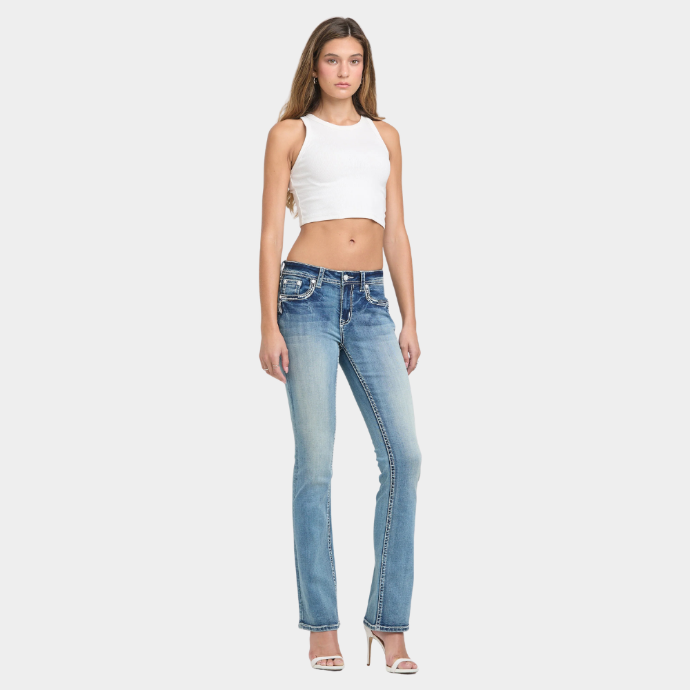 Step into standout western style with these beautifully detailed embroidered jeans from Grace in LA. Designed in the brand’s signature Easy Fit midrise bootcut, this pair offers a flattering shape with a 9.25" front rise and 14.25" back rise giving you comfortable coverage and a smooth, confident fit.