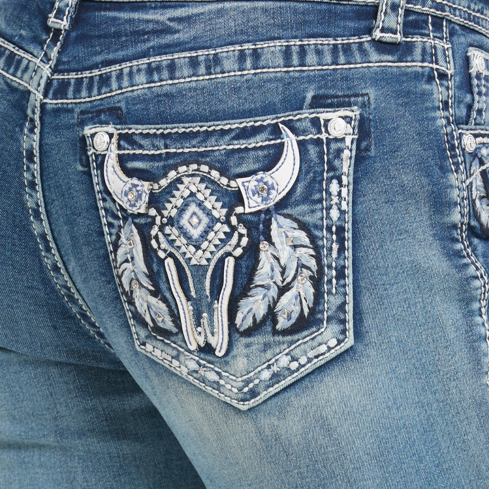 Crafted from a soft, high‑stretch denim blend, these jeans move with you while keeping that classic, structured denim look. The highlight is the 3D dream catcher embroidery on the back pockets, paired with embellished front pockets and subtle hand‑sanding and whiskering for a naturally worn‑in finish. They feel like your favorite jeans from the very first wear.