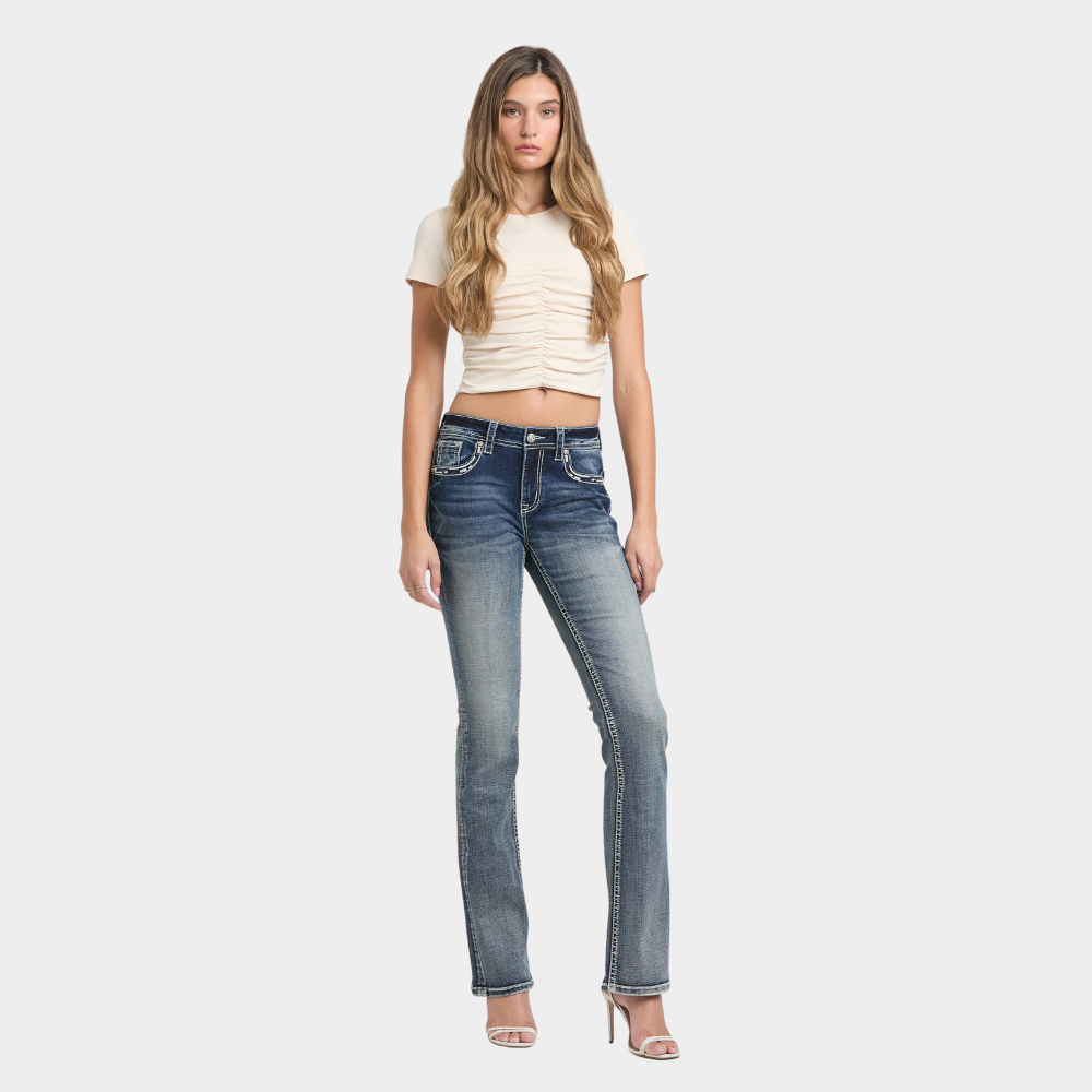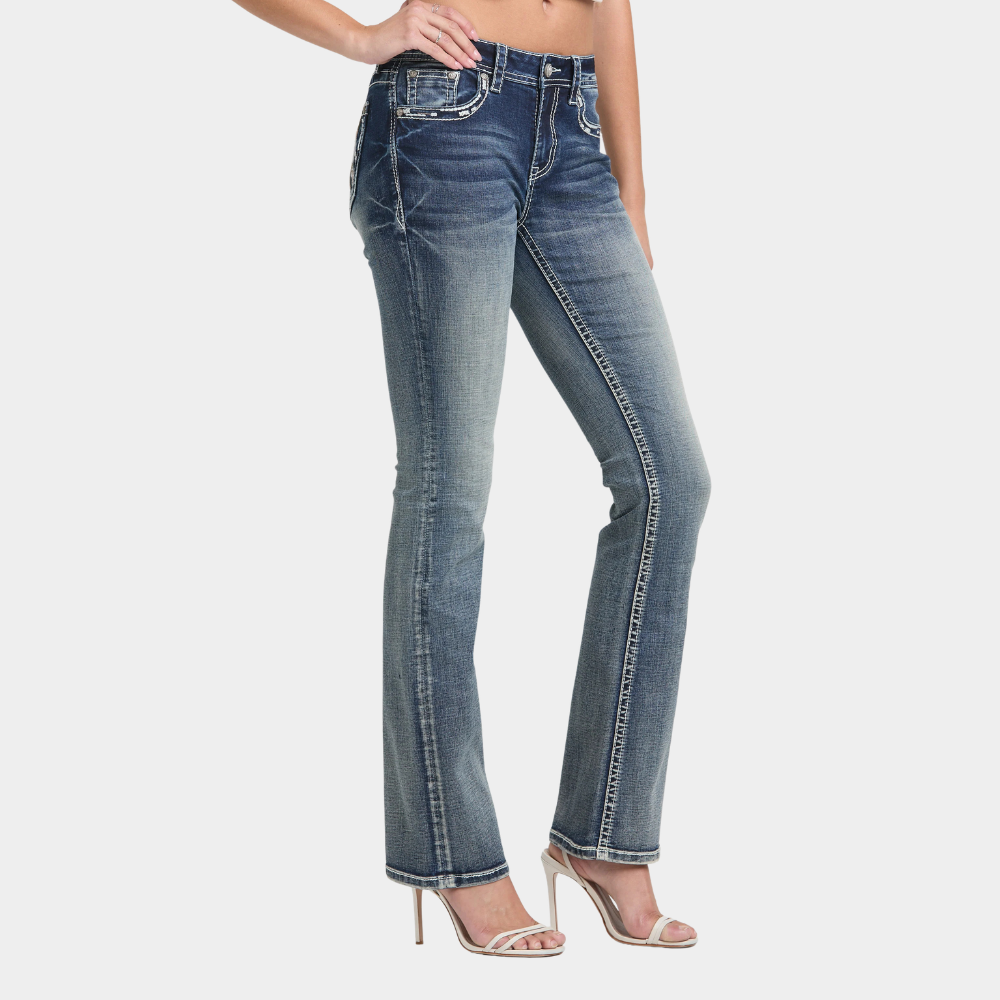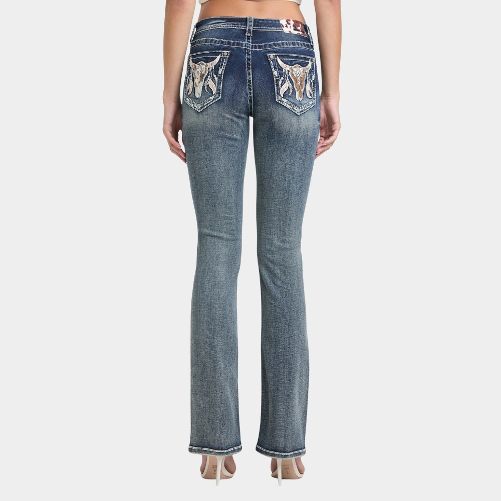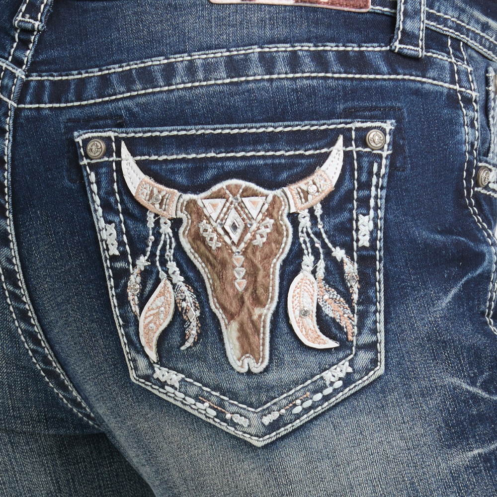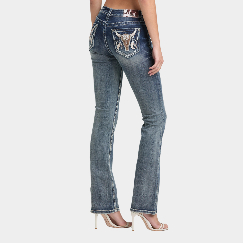 Bring bold western attitude to your denim collection with the Steer Head Modify Bootcut Jeans from Grace in LA. Designed in a flattering mid‑rise Easy Fit, these jeans offer the perfect blend of comfort, structure, and standout detail.