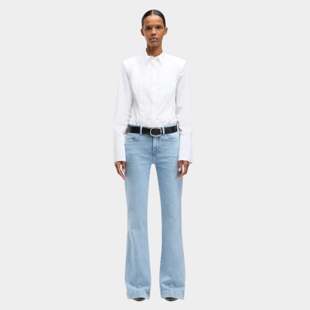 A refined update to our iconic wide-leg Dojo, now with a shorter inseam for a ready-to-wear fit. This mid-rise silhouette elongates and flatters, crafted from sculpting Slim Illusion denim that smooths and lifts like a second skin. Finished with a light wash and crystal-stitched back pockets for subtle shine.