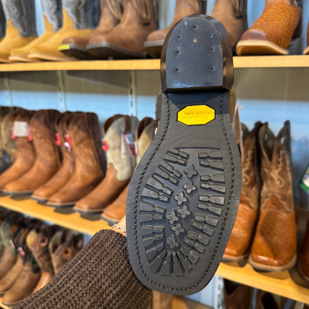 Built tough with Everest Black leather, broad square toe, Vibram sole, and 12" unlined shaft. Features a cowboy heel and roomy Double EE width for all-day comfort.