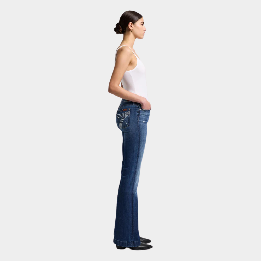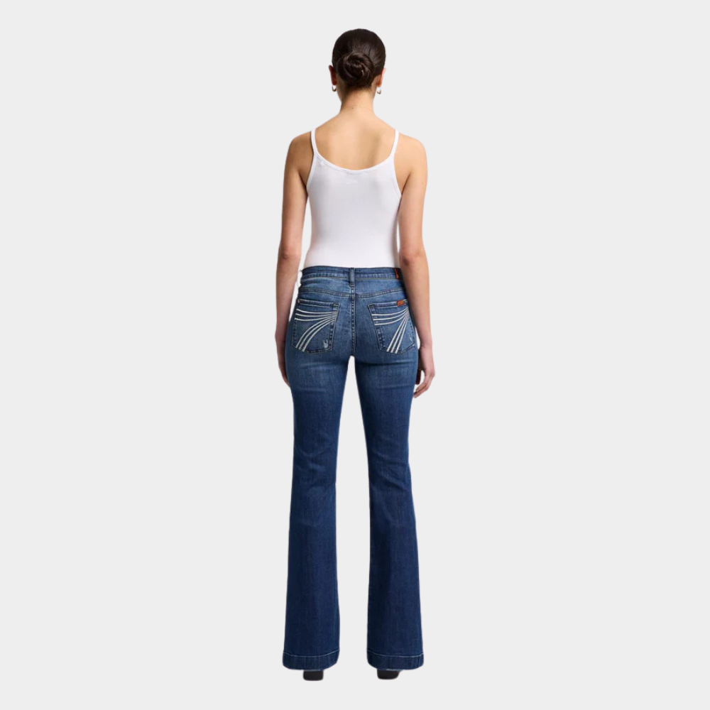 The 7 For All Mankind Lake Blue Dojo 34" Flare Jeans feature a high-rise waist and wide-leg silhouette for a flattering, elongated look. Finished in the bold Lake Blue wash with subtle fading and iconic “7” back pocket embroidery, they deliver modern cowgirl luxury with timeless denim style.