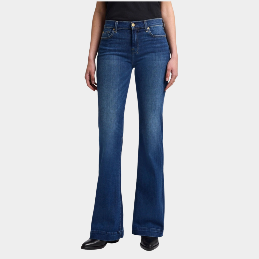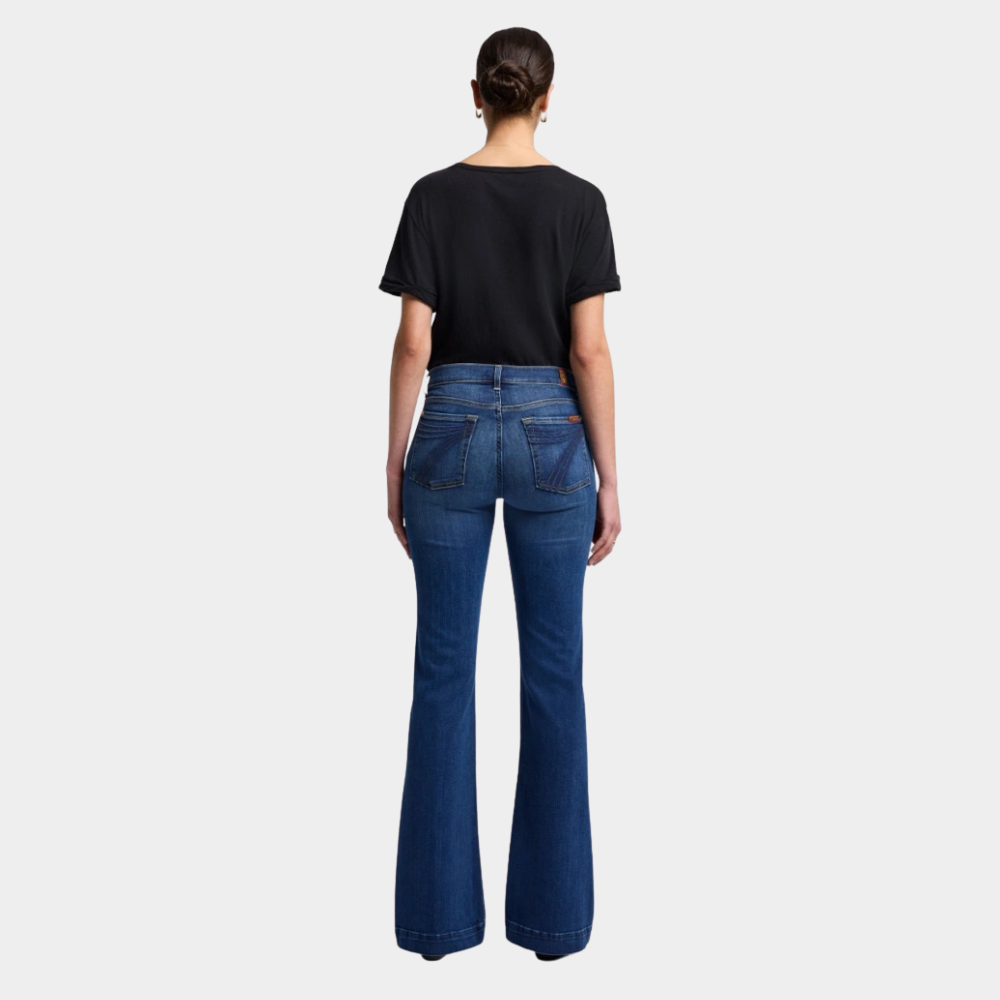 Elevate your denim collection with this sculpting mid-rise jean, designed for a long, lean silhouette. Fitted through the hips and thighs with a full-length wide leg and subtle flare, this premium stretch denim smooths and shapes for a flattering, supportive fit. Finished in a medium indigo wash with signature embroidery and vintage-inspired fading, it’s the perfect blend of comfort, style, and timeless detail. Also available in a shorter inseam as the Tailorless Dojo in Slim Illusion.